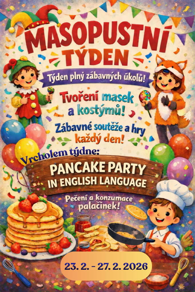 V týdnu od 23. 2. do 27. 2. probíhal na naší škole projekt Masopust, který přinesl dětem spoustu zážitků, tvoření i zábavy. Žáci po celý týden plnili tematické úkoly, seznamovali se s tradicemi a zapojovali se do různorodých aktivit. Vrcholem celého týdne bylo pečení palačinek v anglickém jazyce.